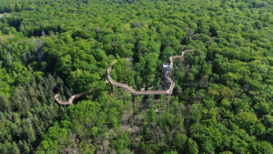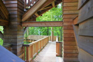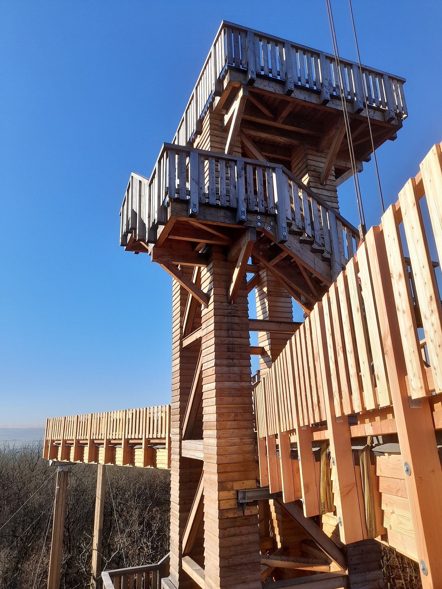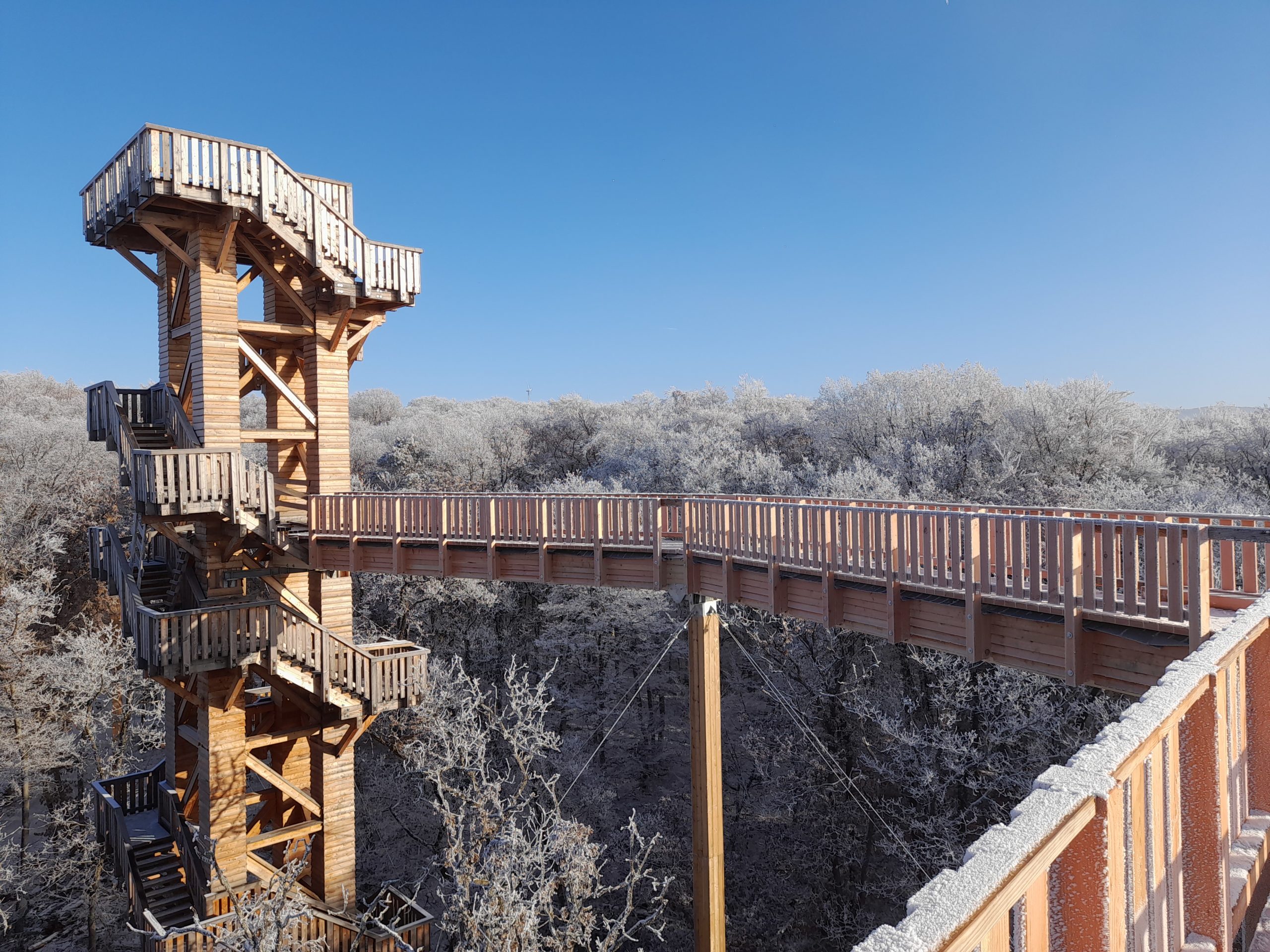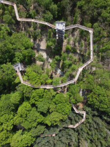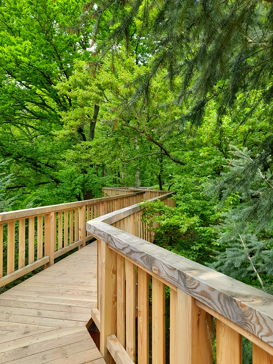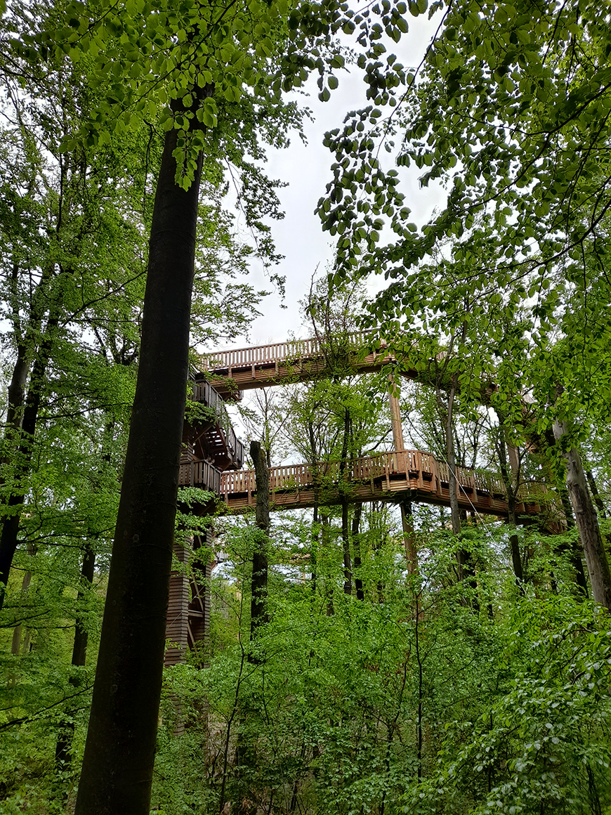 Lass dich von der einzigartigen Naturkulisse verzaubern, während du über Rampen und Treppen bis auf 31 Meter Höhe steigst. Von dort oben erwartet dich eine atemberaubende Fernsicht, die weit über die Baumwipfel hinausreicht und dir einen völlig neuen Blickwinkel auf die Schönheit des Waldes eröffnet.